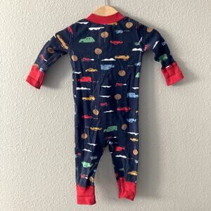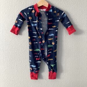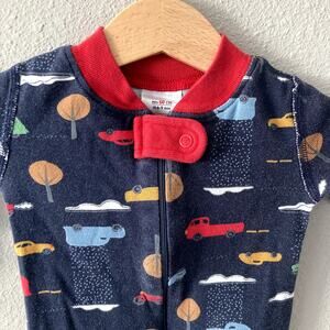 One piece zipper pajamas without feet in navy blue with all over car, tree, motorcycle and cloud print. Red cuffs and neckline. Snug fit.