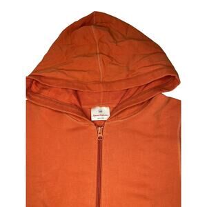 Burnt orange zip up hooded sweatshirt. Lightly lined on the inside with terry cloth. There are stains on the back (see pictures). No holes. Size: 160cm (14/16).