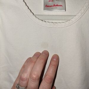 white long sleeve and red short sleeve bright basics t-shirts from Hannah. there is a faded seen on the white shirt and a tiny dark stain on the red shirt as noted in the pictures