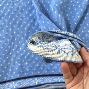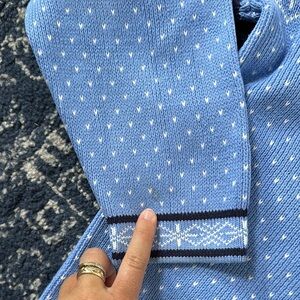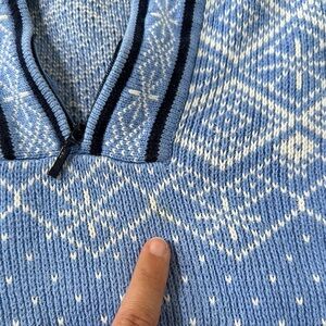 Fair isle sweater. It’s very thick. There are a few stains. There’s a yellow stain on the white in the front, it’s hard to notice. There’s a stain on the sleeve and there’s a stain inside the cuff. Please see photos