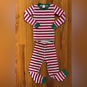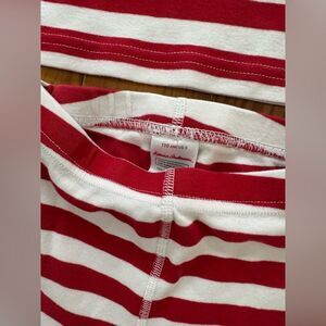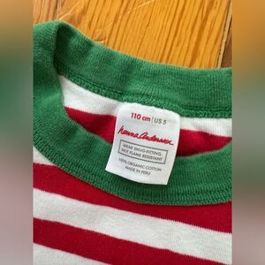 Lightly worn. Red and white stripes. Green collar and hem. Size 5