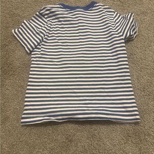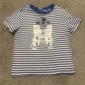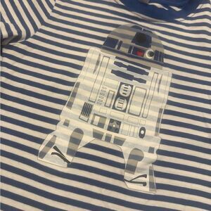 Experience timeless style with this Hanna Andersson tee, featuring classic blue and white stripes. Crafted from lightweight material, this short sleeve top offers comfort and versatility for any casual occasion. Star Wars R2D2 theme. Excellent condition