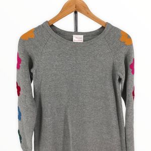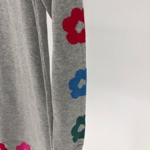 Adorable sweater dress, grey knit with multicolor floral intarsia print at hem and along sleeves. Ribbed trim along neckline, hem and cuffs of long sleeves.