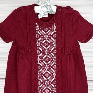 Hanna Andersson Short Sleeve Fair Isle Knit Sweater Burgundy Dress. Cute short sleeves! 80% cotton 20% wool. Shoulder button closure. Size 85 cm, US 2, length 19 inches. Great condition, no flaws.