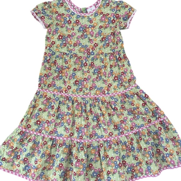 Multicolored whimsical floral print trimmed out in gingham and eyelet perfect for parties or school