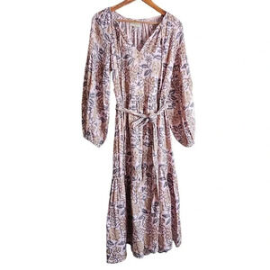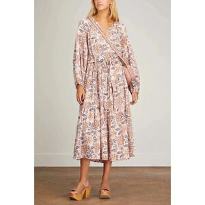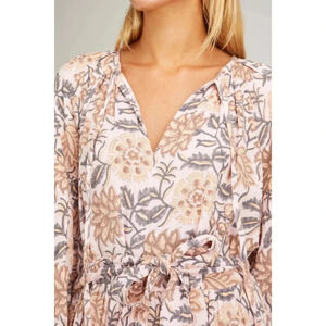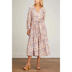 Hannah Artwear Ambrosia Dress in Ivy. Size 4 (US). Features v-neckline with tie, long blouson sleeves with cinched cuffs, self tie waistband, shirred detailing at the neckline and back, floral print, tiered skirt, relaxed fit, and midi length. 100% Cotton Gauze. NWT / New with tags.