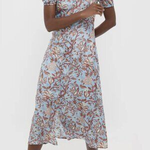 The Fernando Sky Olivia Dress features a soft A-line silhouette and short gathered sleeves. Style this midi with a chic bag and minimal flats for city wanderings and coastal afternoons.