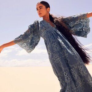 *V neckline, placed skilfully to show-off the fabric edge scalloping *Wide 3/4 length sleeve finished on scallop border edge * Gathered detailing under bust with fabric waist tie *Midi skirt length *Skirt hem finished on scallop border edge *CB invisible zip *Bodice, and skirt fully lined in match cotton voile *Fitted through bust , loose from under-bust to hem *The Rosa Dress is true to size *Broderie Anglaise is dyed, woven and embroidered in India. *The Rosa Dress is true to size US 6 *Fitted through bust , loose from under-bust to hem