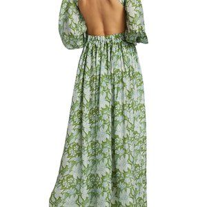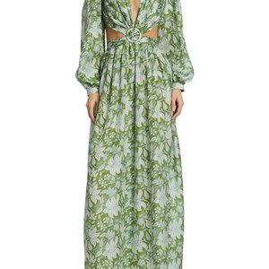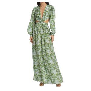 This silk dress is decorated with a floral print, featuring cut-out details and flowy sleeves.