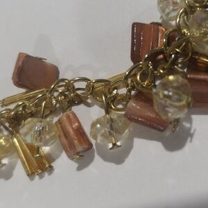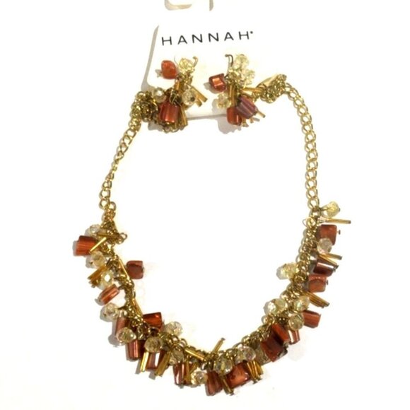 This chic jewelry set by Hannah includes a gold-tone chain necklace adorned with vibrant beads in amber, clear, and bronze hues, paired with matching drop earrings. The cluster design creates a striking and fashionable statement, ideal for elevating any outfit, whether for a casual day out or a formal evening event.