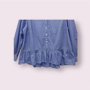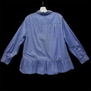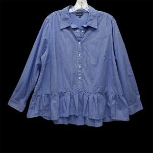 Hannah Plus Size Women 1X Top Blue White Stripe Ruffle Bottom Button up Peplum