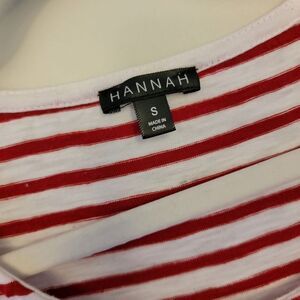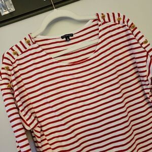 Striped top with gold button details on shoulders and embroidered ruffled bottom.