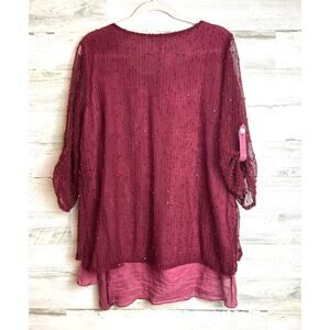 Hannah Women’s Large Cranberry Red Boho Layered Roll Sleeve Sequin Blouse NEW