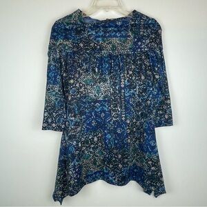 Hannah Women’s Small Blue Black Boho Print Tunic Top 3/4 Sleeve