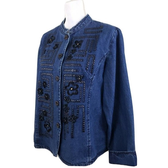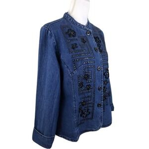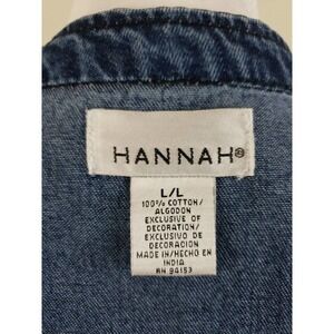 Hannah ~Woman Size L~ Blue Denim Cotton Decorated Button-Up Long Sleeve Jacket Unlined.