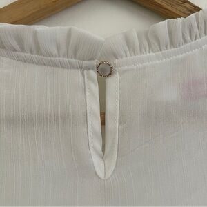 This charming blouse by Annie showcases a soft cream color, enhanced by pleated and ruffled details. The short sleeves and peter pan collar lend a vintage-inspired elegance, while the lightweight fabric offers a comfortable fit. Ideal for adding a touch of sophistication to any outfit.