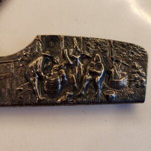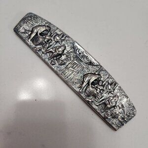 Vintage Hans Jensen Danish Silver Plate Tavern Scene pocket comb in tortoise shell in case. The Tavern scene is the same on both sides of the case. Pictures show before and after polishing. The comb is plastic tortoiseshell design. The case is marked Denmark along the edge.