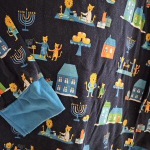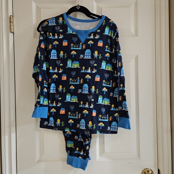 Women's Hanukkah cotton PJ set. Long sleeves with elastic waist and cuffs at wrists and ankles, 25" pit to pit.