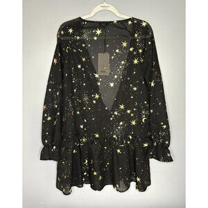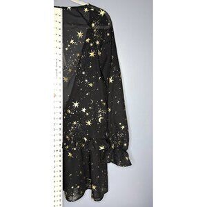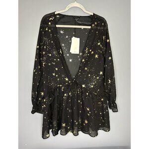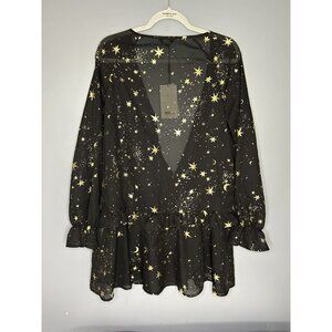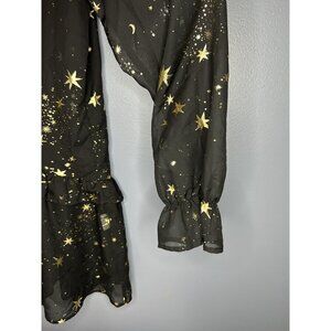 Haoduoyi Mini Dress Womens XL Black Gold Star Moon Sheer Chiffon Long Sleeve Tunic Top