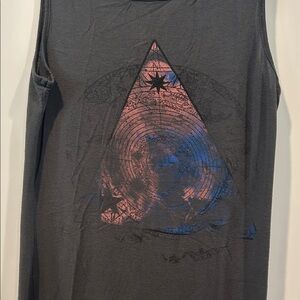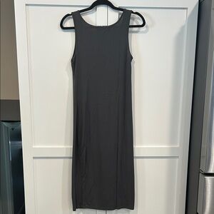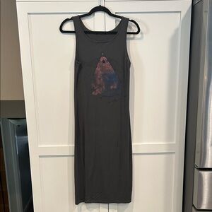 Stylish gray midi dress. Sleeveless design. Features unique front graphic. It was my favorite dress at one time in my life but, sadly it just doesn’t fit anymore. I’ve had some great times in this dress and it deserves a fun and fashionable new home! Still has some wear in her! I always styled it with chunky platforms or docs and a denim jacket when needed.