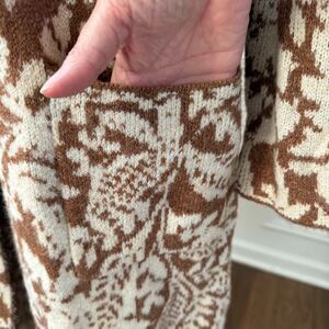 Is it a cardigan or a coat? This faux fur collared long and chunky cardigan. Duster is a little bit of both. Open front (there was a single hook and loop closure but the loop came off and we wore it open anyway). Brown and parchment sweater mint pattern with a white beige wide shawl fur collar. The fur is 100% polyester and the sweat sweater itself is acrylic, polyester and spandex blend. Machine washable. Tag size large. Laying flat measures 40 inches shoulder to him and 20 inches armpit to armpit with the open seam touching.