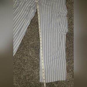 Stylish cargo pants with blue and white stripes. Features multiple pockets for convenience.