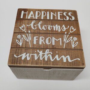 Distressed slat wood hinged box has a hand lettered "Happiness Blooms From Within" sentiment with flower designs.