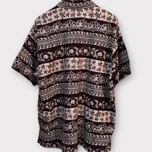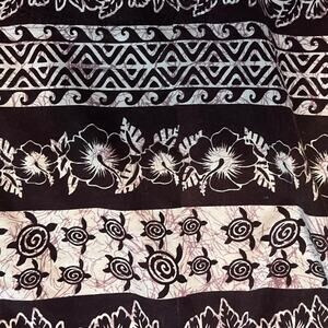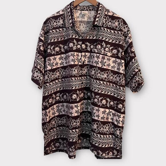Fabulous Hawaiian Shirt from Happy Bay. 100% cotton, brown and white print features flowers, turtles, Polynesian geometric shapes. Button front short sleeve with chest pocket.