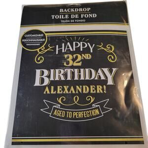 Celebrate in style with this "Happy Birthday" backdrop. The customizable banner includes 2 sheets measuring 32.5 x 65 in and sticker sheets for personalization. Perfect for milestone birthday decor or photo booth background.