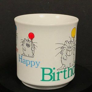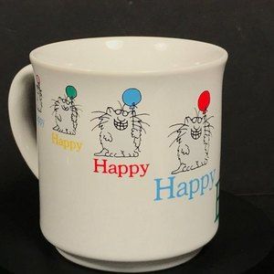 Vintage Sandra Boynton Happy Birthday coffee mug. Features numerous cats from smallest to largest encircling the mug. Each one is holding a colorful balloon with the text "Happy" on it and what I love is as you look at the progression of cats, they go from expressionless to a toothy smile. It will be sure to put a smile on any one's face! Makes a nice gift to give from a family, group of co-workers or group of friends. Made in Japan and in excellent shape. Please zoom in on photos for detail. If