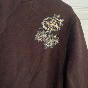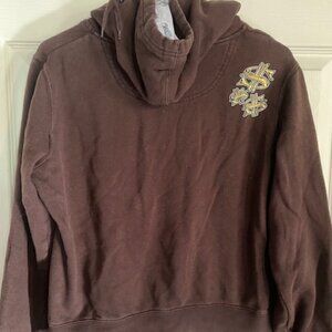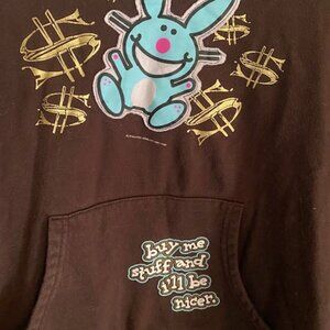 In good condition is a cute Happy Bunny hoodie sweatshirt, brown, with "Buy me stuff and I'll be nice", girls size large, women's size small