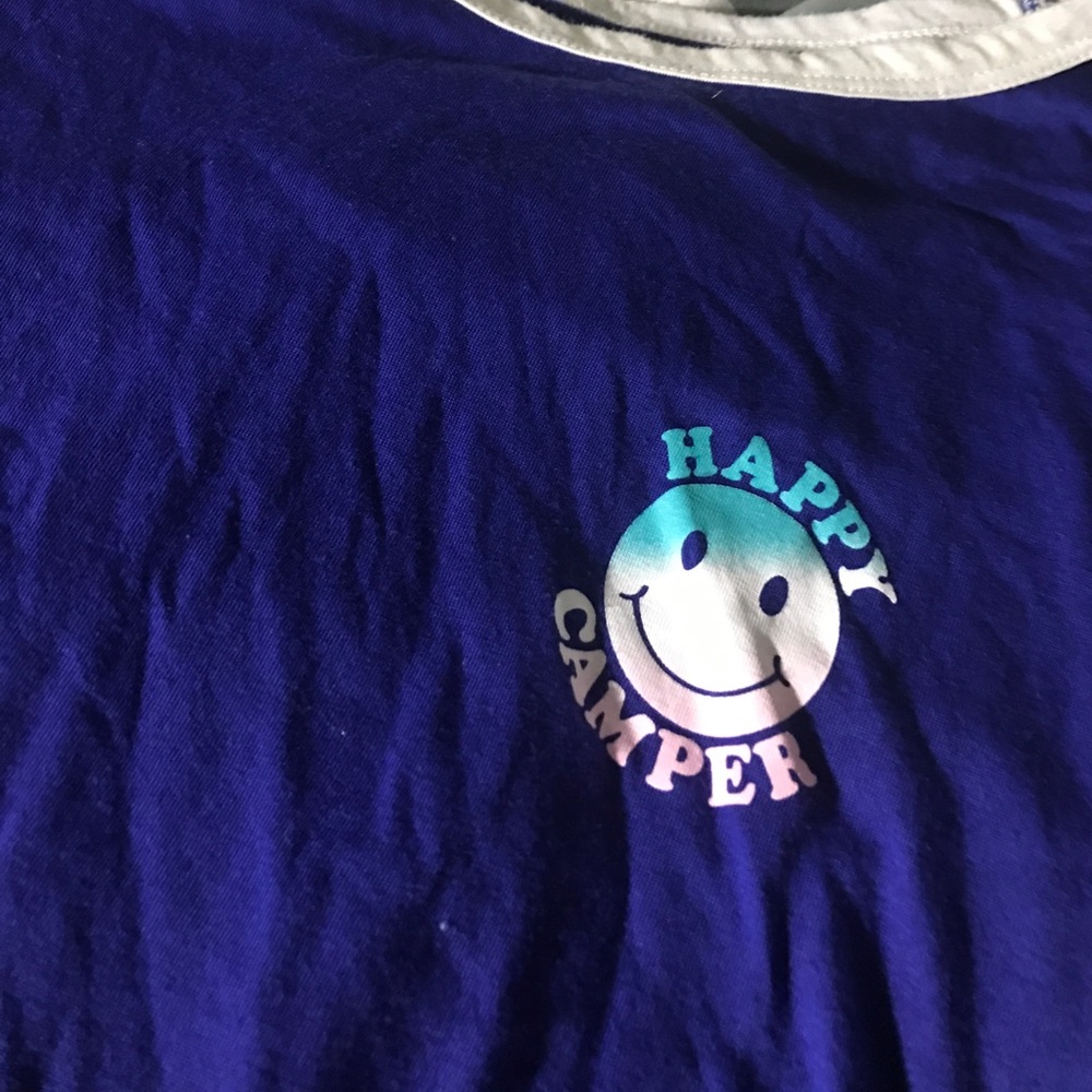 Blue ringer tee, with happy camper design and smiley face.