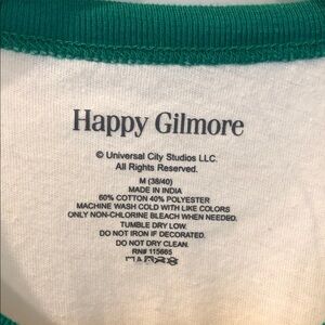 White t-shirt featuring 'Happy Gilmore' text and green trim.