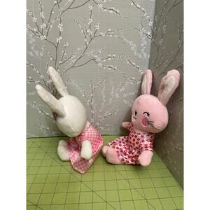 Happy Go Fluffy White & Pink Easter Bunny Rabbit Plush Stuffed Satin 11” Set Lot