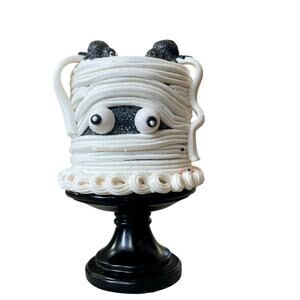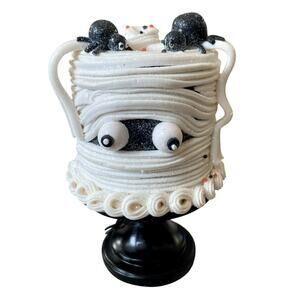 Candy Corn Lane Halloween Mummy Cake On Stand 6.5in Black White Glitter