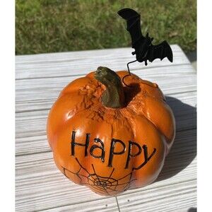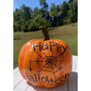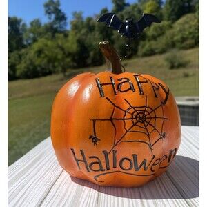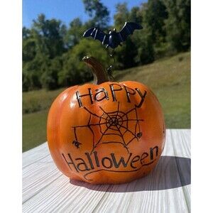 Add a touch of spooky charm to your Halloween and Fall decor with this Happy Halloween pumpkin jack o lantern. It has a cute little bat on the top. Made of ceramic type material, this pumpkin is built to last and will become a treasured addition to your collection for years to come. Perfect for table décor, this pumpkin is an ideal choice for Fall and Halloween enthusiasts who want to add a touch of eerie elegance to their home.