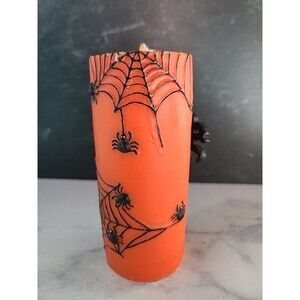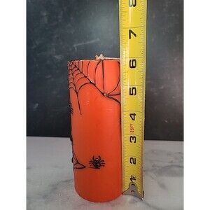 This is an orange and black Halloween themed candle adorned with spiders and webs.