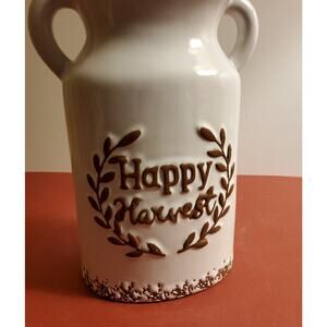 This 8" tall, 6" in diameter, ceramic vase features dual side handles and an embossed "Happy Harvest" design framed by laurel leaves. It's glossy ivory glaze with rustic brown detailing gives it a farmhouse look perfect for autumn decor.