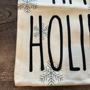 New without tags (NWOT) never used indoor/outdoor holiday pillow cover. Dimensions are 18” x 18”. Cover zips open on one side. Off white/cream pillow cover is great neutral to match any decor and has subtle holiday theming with simple “HAPPY HOLIDAYS” in black lettering with some green snowflakes. Reverse side is solid off white/cream. Material is soft but has a burlap feel making it somewhat waterproof for use on a covered porch or patio during the holiday season.