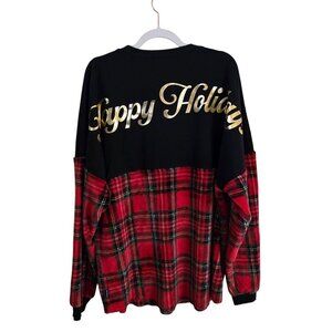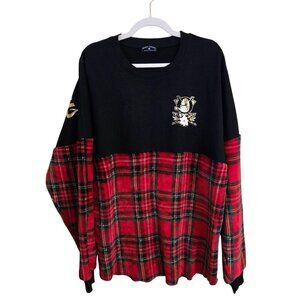 Celebrate the festive season in this cozy and rare red plaid velour Unisex Anaheim Mighty Ducks spirit jersey. Featuring gold lettering and a small imperfection on the back shoulder, this size XL fleece top is perfect for holiday gatherings.