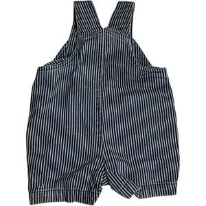 Classic blue and white pinstripe shortalls with “Team Sports” embroidered patch across the chest featuring a baseball, soccer ball, and basketball. Button straps with side closures and pockets. Playful and sporty retro baby piece. Preloved with light wear on the patch, overall good condition.