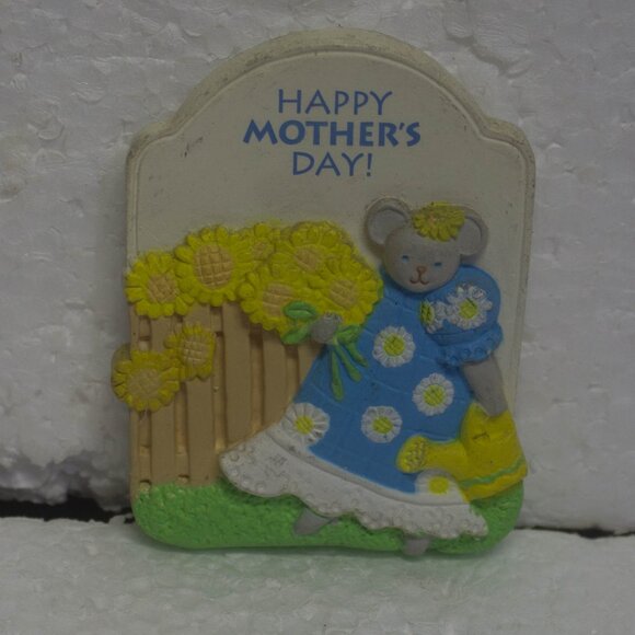 Say Happy Mother's Day to your mom with this keepsake refrigerator magnet featuring a mouse in a blue dress watering her sunflower. This little magnet is about 2x2.5 inches. Say Happy Mother's day all year long. Some minor scuffs to the surface to the magnet can be expected.