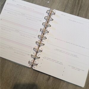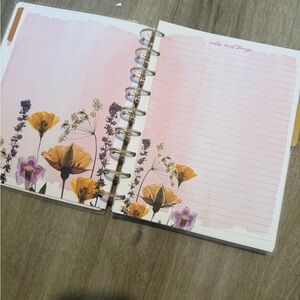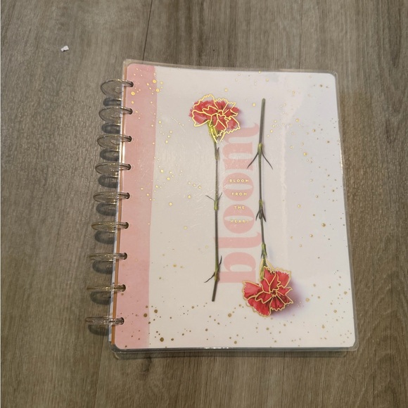 Elegant planner with pink cover. Features gold accents and floral design. Perfect for organizing your thoughts.