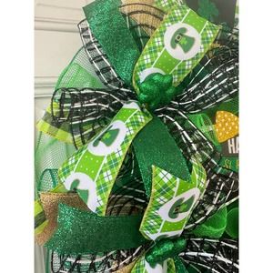 Beautiful handmade Mesh Wreath embellished with a Leprechaun sign surrounded by beautiful coordinating ribbons and glitter shamrocks.