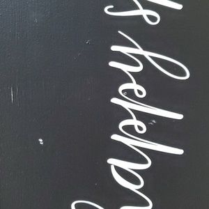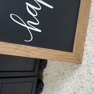 Happy Spring sign. Black with white lettering in a wood frame. Has a few little marks that could be covered with black paint or black marker. Size is about 20" W X 12" H. NWT had marks when purchased.