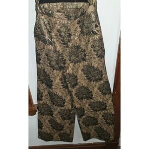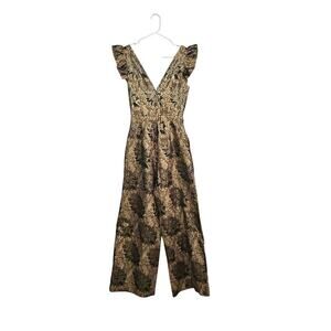 Happy x Nature Gold Metallic Floral Tie Front Jumpsuit Sleeveless V-Neck Wide Leg Size 4 Small, Ruffle Sleeve, Side Zip, Thick Material. Very Flattering, Front pockets. Excellent Condition! Cotton/Polyester/Spandex/Metallic.