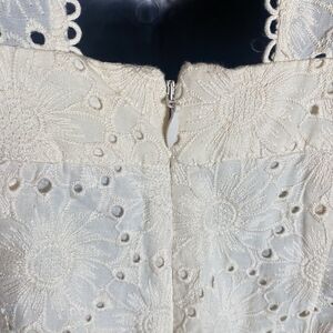 Happy x nature cream eyelet romper ruffle size 6 Keyhole open back Pockets NWT One small flaw where a loop has come undone, easy sew fix (pictured) Lined Floral design. Eyelet. Appx measures Length 32.5” Inseam 3” Pit to pit 17” Country. Prairie. Feminine. Flirty. Eyelet. Event. Occasion. Baby shower. Bridal shower.Kate Hudson. Romper. Coquette, girly, dainty , fairy, fairycore, daisy,