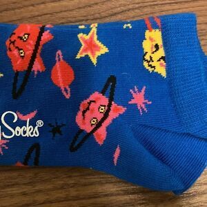 Happy Socks 2 pairs. Low socks in royal blue with space cats. Knee socks with colorful big dots, yellow metallic cuff and aqua metallic hell. Both are size US woman 10-12.5/ US Men 8-12.