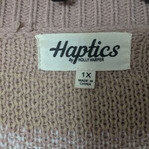 Chic cardigan with a bold pattern. Perfect for layering. Aztec/Native design with two front pockets, cardigan is open with no buttons. Colors are light tan, dark navy blue and white. Super cute with denim or leggings. Size is 1x, non smoking, pet friendly home. purchased at boutique, brand is Haptics.