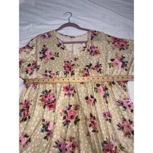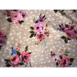 Soft stretchy jersey knit beige with pink blue and purple flowers. Free size baby doll style could be used multiple ways. Has POCKETS! See measurements in photos. Polyester spandex blend.